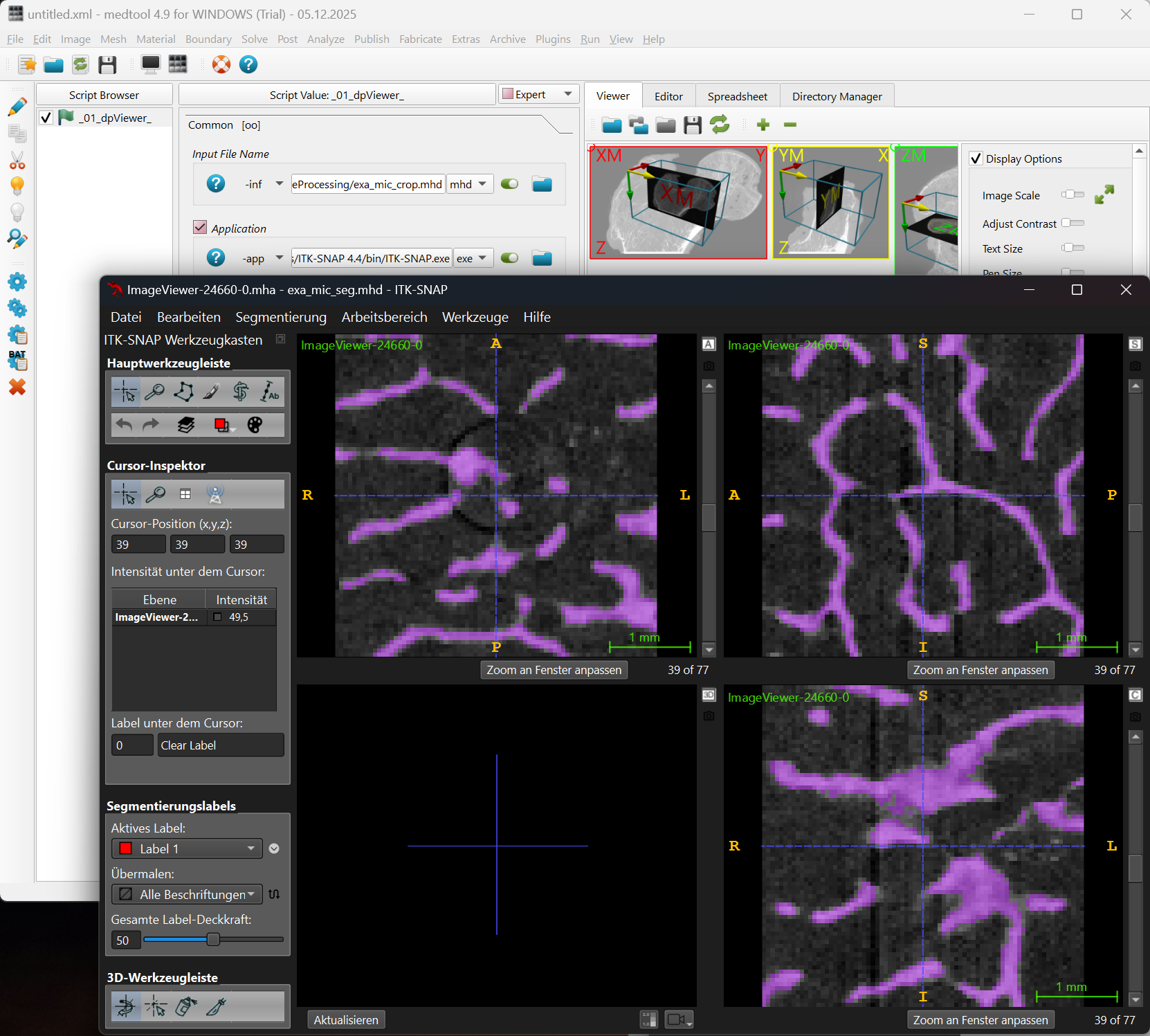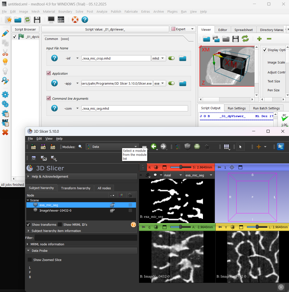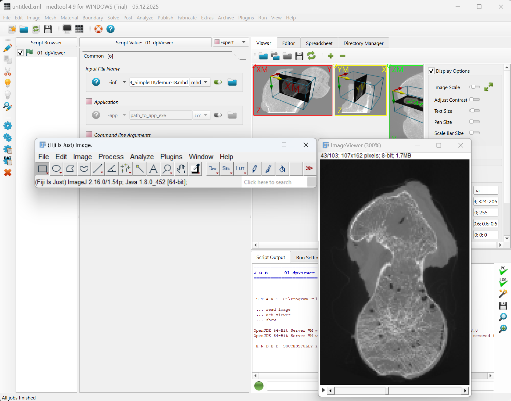The module contains scripts to read, convert, write, and process medical images. Beside standard image processing tools, many algorithm are added to create finite element simulation models. The image processor is able to run SimpleITK scripts. Visual interactions are possible via 3D Viewer (Fiji, ITK-Snap) or a 3D Slicer bridge which allows to call 3D Slicer from medtool.